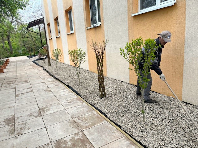 Ako prvé sme uskutočnili terénnu úpravu- vyčistenie a až potom nasledovala výsadba. Po výsadbe sme terén pripravili na zásyp okrasnými kameňmi. Vytvoríme tak rekreačný priestor pre klientov , ktorí sa pohybujú a trávia veľkú časť dňa v areáli zariadenia.