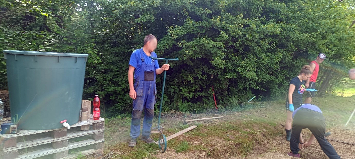 Rozdelili sme sa do dvoch skupín, kde jedna skupina sadila zemiaky, kukuricu, hrášok, fazuľu, cuketu. A druhá skupina sa pustila do výsevu- uhoriek, mrkvy, petržlenu, reďkovky, cibuli a šalátu.